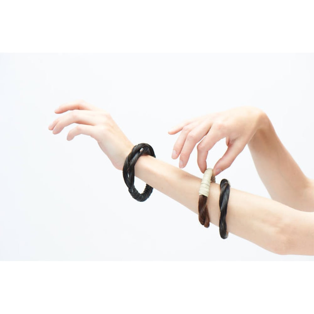 Horsehair is twisted and wrapped to form a bangle that slips on over the hand. Leather wrapping around the lower portion. Available in Jet, Ivory, Sorrel, or Silver.